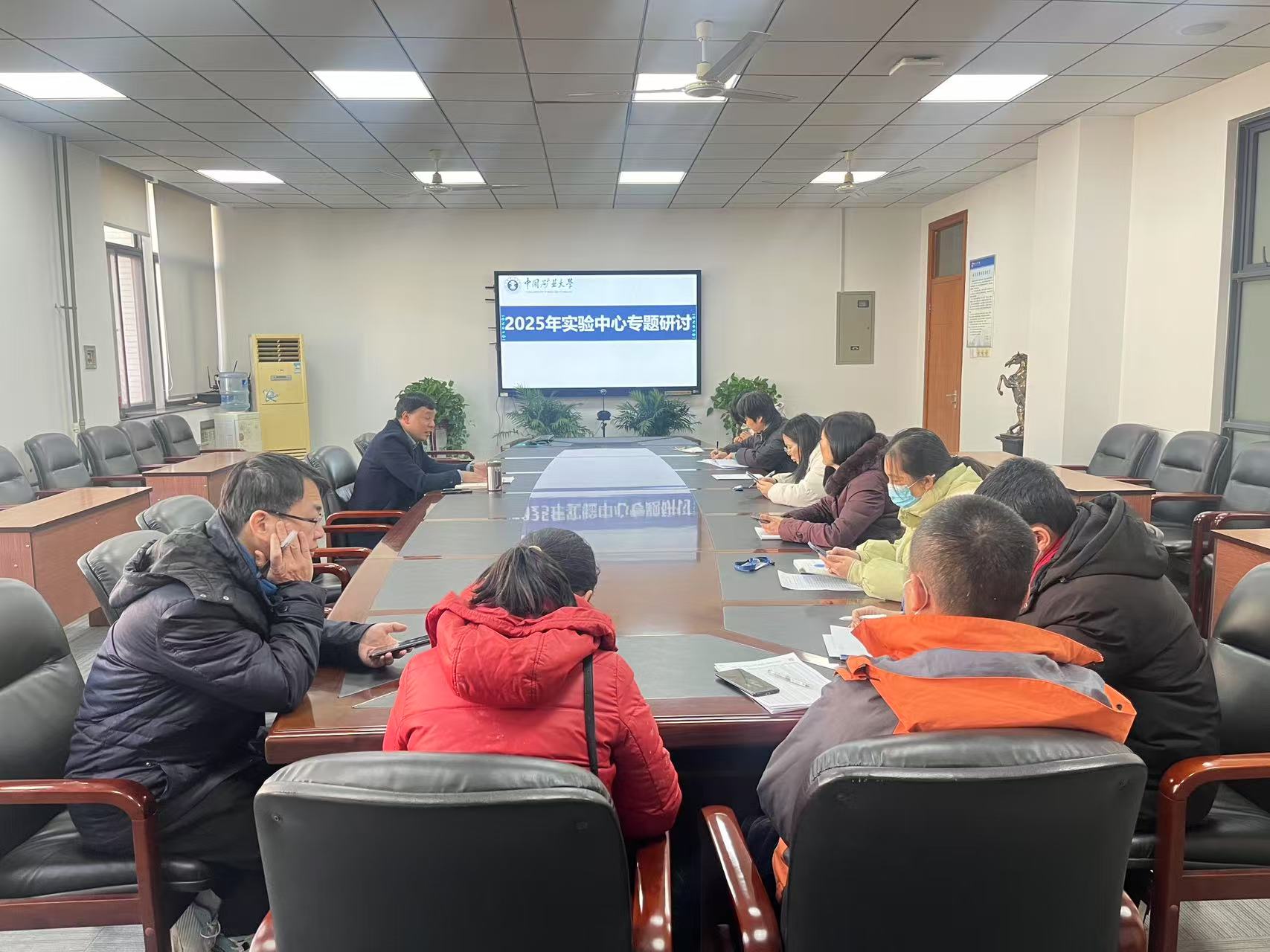 最后,王院长对寒假期间的实验室工作进行了详细布置。在安全方面,做好寒假值班工作,加强巡视和记录,对寒假期间继续使用的实验室做好安全提醒和保障工作,及时排查并处理安全隐患。同时协助各专业做好下学期的实验教学保障服务工作,一是针对教学实验室的仪器维护和修缮,尽量在寒假完成,以保障下学期实验教学工作的顺利开展;二是对示范中心“智慧矿山实验室”后续工作做好规划,确保顺利实施。